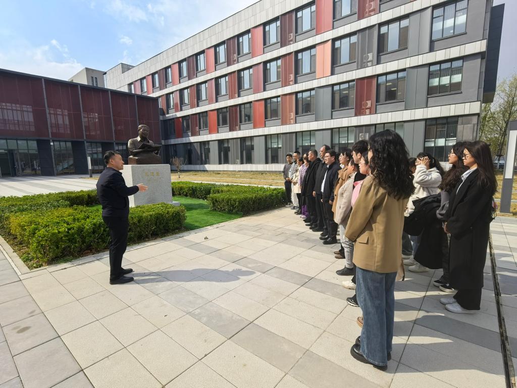 随后,师生来到李继之塑像前,行鞠躬礼。校友服务与管理中心主任杨琥应邀介绍了李继之爱党爱国、治学兴校的生平事迹。不忘师范初心,忠诚教育事业,高扬改革旗帜,全心全意“学师范、教学生、搞教育”,李继之老校长明确学校发展思路,加强学科建设与专业建设,抓科研促教学,为太阳城振兴发展做出杰出贡献。如今,身边的“继之青年”,脚下的“继之路”,李继之老校长仍然时时陪伴着我们。
