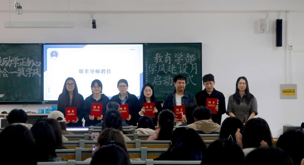 本站讯(通讯员 王立冬 王浩禹)为涵养勤学善思的优良学风,引导学生树立远大志向,养成良好的学习习惯,4月10日,教育学部开展“弘毅励学正初心,知行合一筑学风”学风建设月启动仪式,学部党委副书记吴文婧、教学副部长高维、学工办副主任门宇辰、辅导员、各班学习委员及学生代表共100余人参加启动仪式。