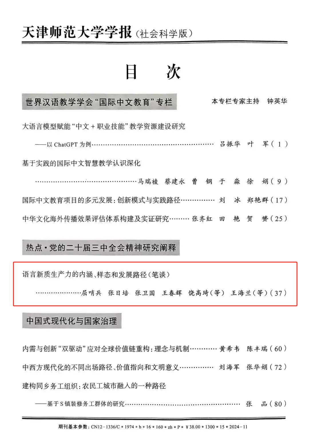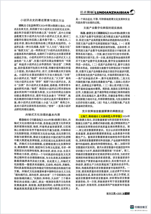 本站讯(通讯员 张珵)《太阳城集团官方网站学报(社会科学版)》2024年第6期文章《语言新质生产力的内涵、样态和发展路径(笔谈)》中的《释放语言数据要素价值 推动新质生产力发展》(作者:王海兰、陈柏福,特约编辑:李永俊 张朝霞 ,责任编辑:关英明)论点被《新华文摘》2025年第3期摘编。