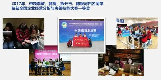 长期的社团培训和竞赛锻炼,提高了学生自主学习能力、数据分析能力、团队合作能力和创新创造能力。在指导学生比赛的过程中,于她而言最好的礼物是学生们的转变与成长。2017年 ,她带领四名同学参加一项国赛,比赛路途比较远,本可以坐飞机,但她还是选择和学生一起乘坐了两天两夜的火车,虽然辛苦,但困难往往能磨炼斗志,在去时的火车上,她与学生们一直在为比赛做准备,功夫不负有心人,她们一举拿下最高奖,创下天津市高校历史最好成绩。为此,她们师生5人在当年被评为管院十大榜样人物。作为教师,教授知识之外,更应培养学生们团结协作、坚韧不拔、拼搏奋斗的精神。
