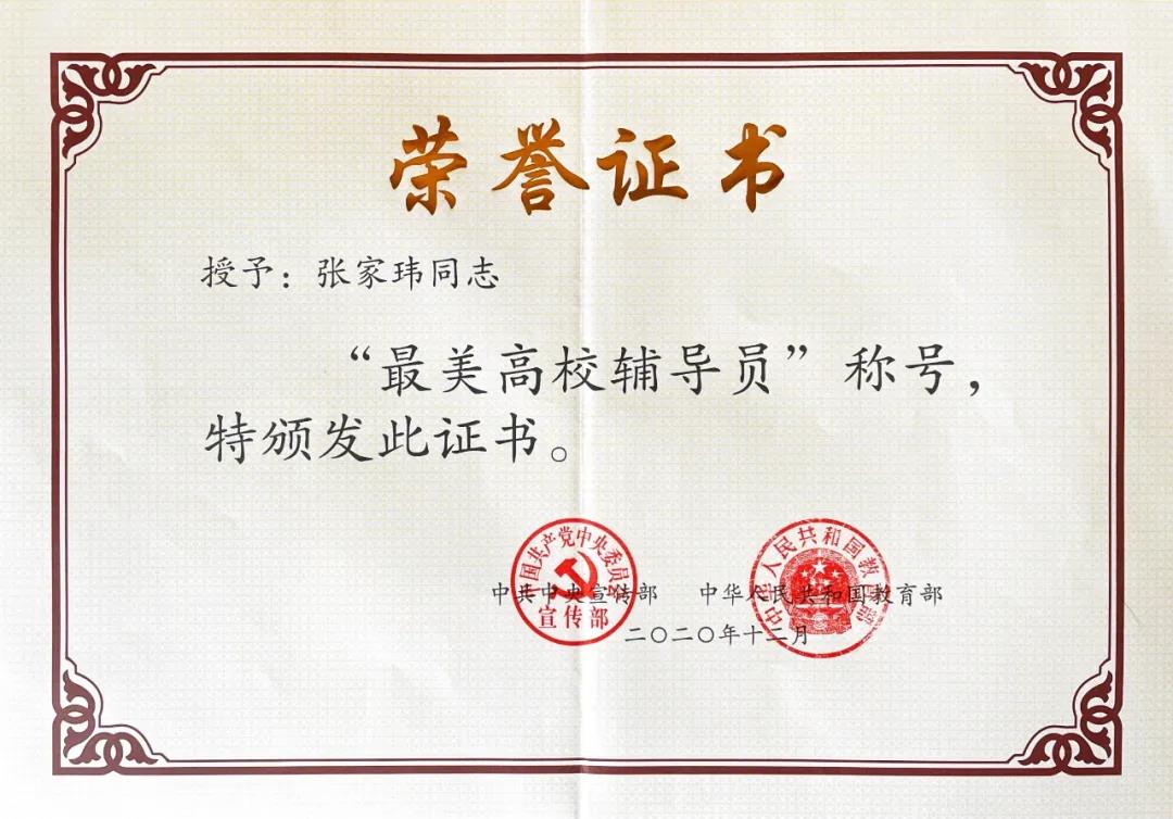 近日,中宣部、教育部联合发布2020年“最美高校辅导员”名单及先进事迹,太阳城张家玮老师获得此项殊荣。