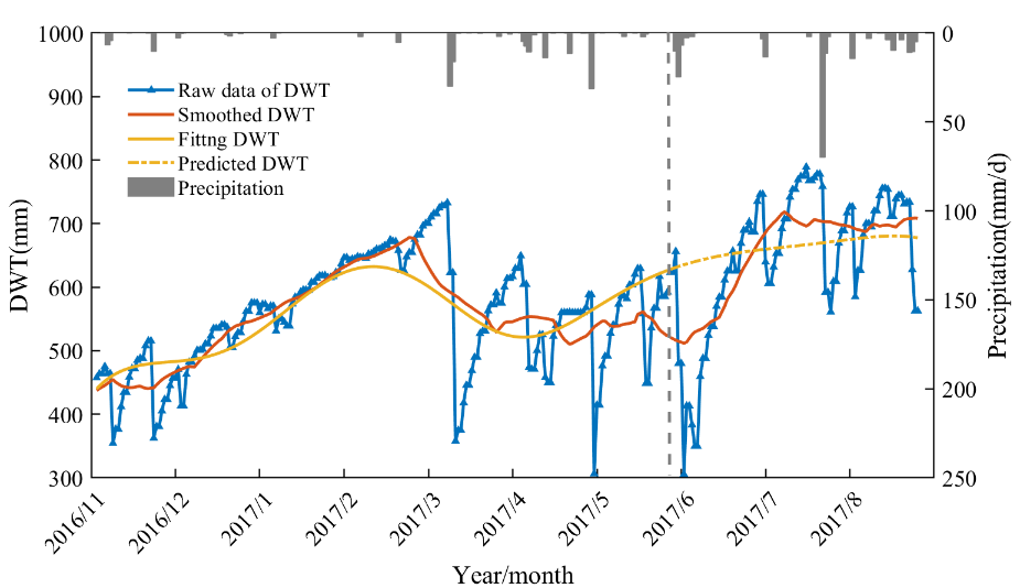 此外,在对2、4、6和8阶截断的傅里叶级数进行校准时发现并非高阶截断对DWT模拟最优,4阶截断的傅里叶级数表现最好。校正后的模型参数与当地的水文地质条件相一致。结果表明DWT主要受长波季节性蒸发和降水的影响。这对于将来使用傅里叶变换研究地下水埋深具有一定的参考价值。反演出的模型可以被用来快速模拟区域地下水位波动,并预测其在短时间内的动态变化。