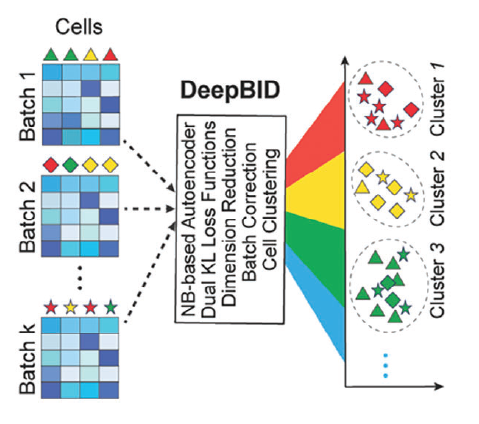 随着不同实验室、不同实验环境或不同实验协议生成的相同组织或细胞系的大规模单细胞转录组数据集,对这些数据集进行去噪以消除批次效应,确保生物问题的准确解释和全面分析至关重要。因此,单细胞组学数据整合分析成为生物和医学领域重要的问题之一。为此,项目组设计了一种新的基于深度学习的解决方案DeepBID,用于多批次单细胞组学数据的整合和去噪。DeepBID不仅可以纠正批次效应,还可以同时实现非线性降维、嵌入和聚类,与现有方法相比具有卓越的性能。实验表明DeepBID在阿尔茨海默病研究中显著增强了细胞聚类、细胞注释和差异表达基因鉴定方面的能力。