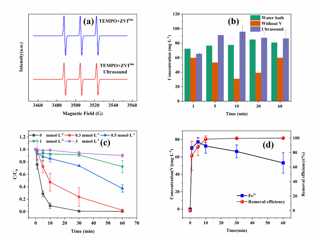 图1 球磨铁和超声球磨铁的EPR表征(a);超声/水浴条件下Fe2+含量的变化(b);淬灭实验(c);亚铁浓度变化与钒去除率(d).