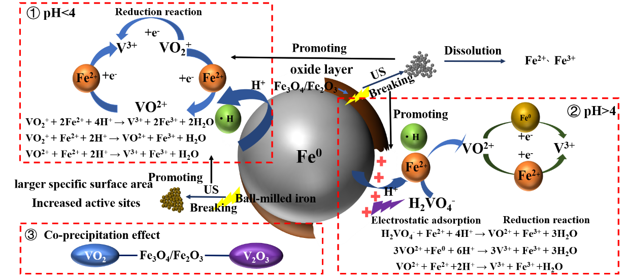 在实验表征数据的支撑下,研究得出超声-球磨零价铁去除水体钒的三阶段:第一阶段,在超声波的作用下,V5+在反应的前10 min内,即pH < 4时,通过还原作用迅速还原到其较低的氧化态。第二阶段,pH> 4时,体系内电荷性质的变化,静电吸附作用逐渐参与到反应当中去。第三阶段,以Fe3+离子浓度快速下降为标志,通过铁氧化物与钒氧化物的络合共沉淀作用固定去除剩余钒离子(如图2所示)。同时,球磨零价铁材料在超声作用下,具有良好的可重复利用性,五次循环利用去除效率依然高于99%,得益于球磨零价铁材料逐步展现出的强大吸附能力。然而,仍需要进一步探究在实际工业含钒废水处理当中,超声-球磨零价铁的去除性能与工艺成本等问题。